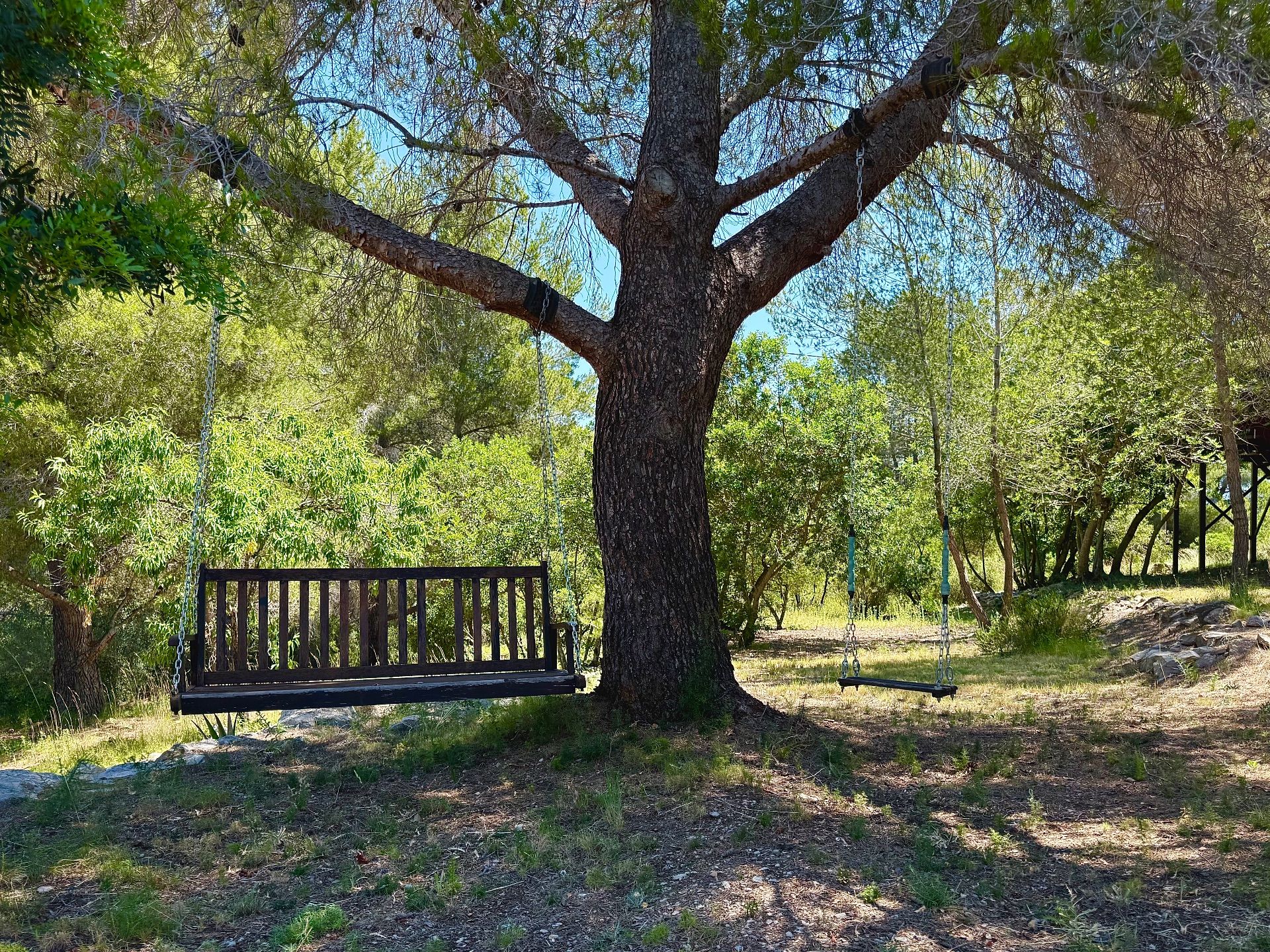 Rodeando la finca, una extensa pinada resguarda una casita en el árbol, añadiendo un toque mágico al entorno.